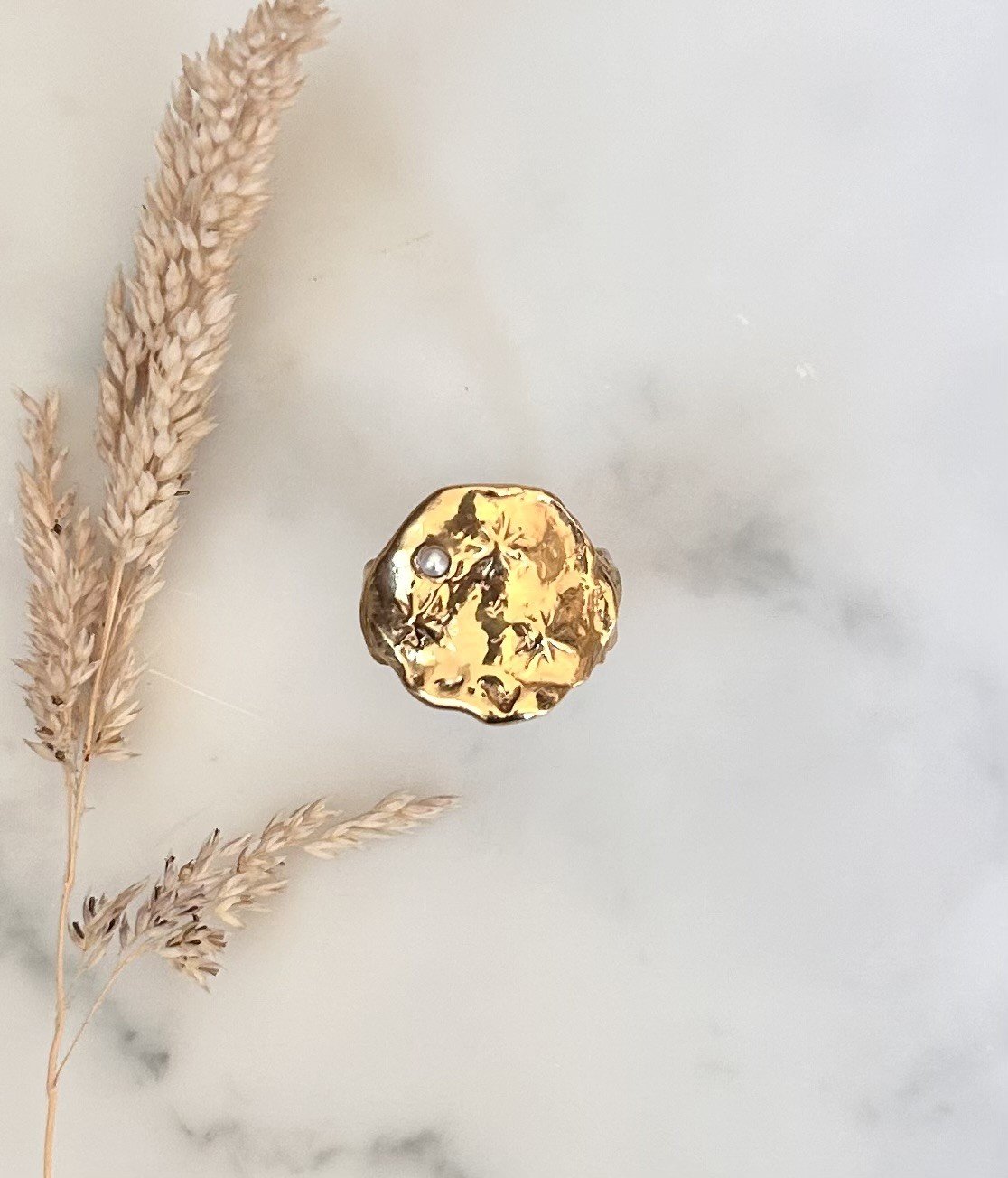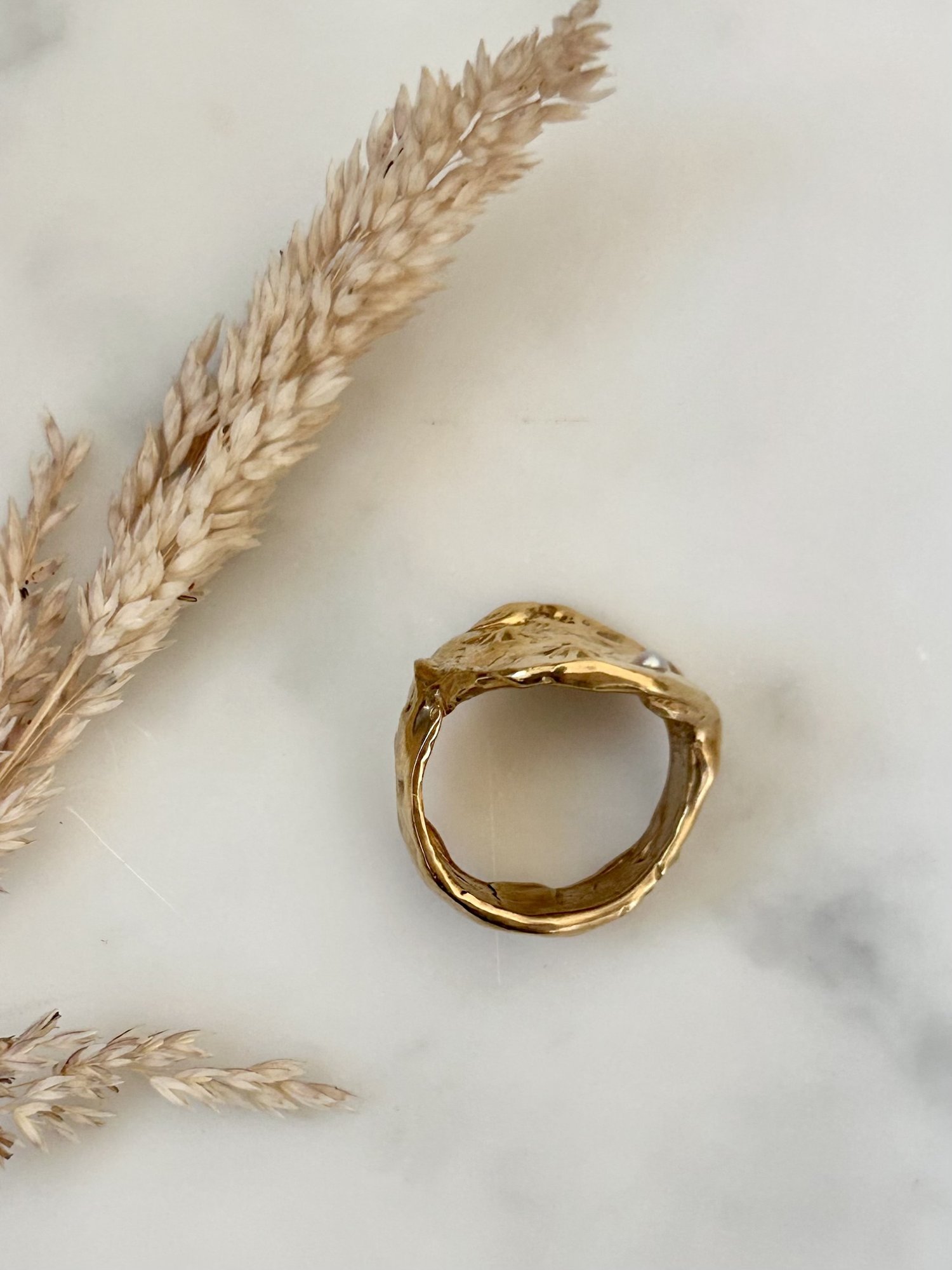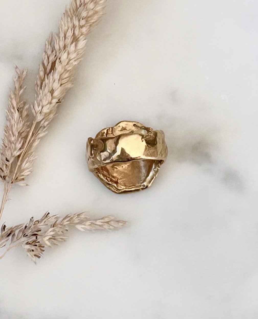 The Febe ring in this picture is handmade using the lost-wax casting technique. It is cast in solid certified recycled bronze and it is gold plated in 3micron 18ct yellow gold.